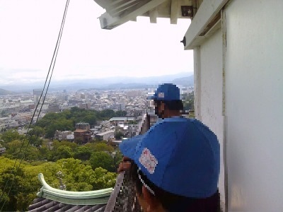 犬山城では急な階段を登り、天守閣から犬山市内をみました。